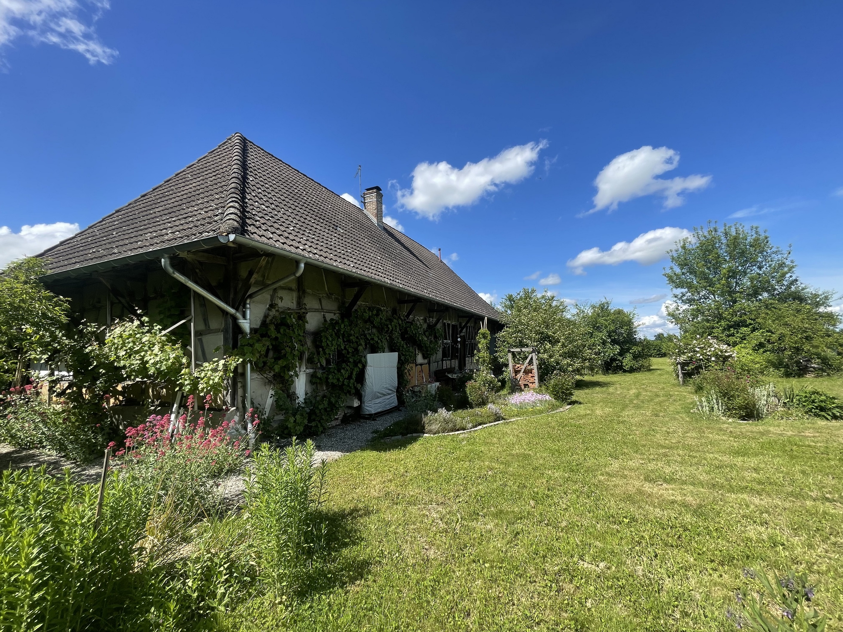 | Corps de ferme bressan, situé au calme et sans vis-à-vis, comprenant une ferme d'habitation sur 90 m² habitable, une cuisine équipée, un salon avec un poêle à pellets, une salle à manger avec un poêle à bois et jolies tommettes au sol, deux chambres, une salle d'eau, un wc, dégagement avec lave-mains, deux remises, un atelier, un grenier aménageable ; adoucisseur d'eau. Un bâtiment d'hébergeage indépendant avec grange, écuries et remises. Un autre bâtiment avec tecks, local poubelle, bûcher et remises. Le tout sur un terrain joliment arboré et clos avec mare, verger et deux puits sur 8389 m².