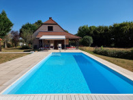 LA CHAPELLE-NAUDE - Dans un environnement calme, à 10 minutes de LOUHANS, propriété bressane offrant sur 160 m² habitable, hall d'entrée avec escaliers, une cuisine équipée, un salon/séjour donnant directement sur une terrasse carrelée exposée au Sud et sur une piscine 10 m x 4 m traitement au sel avec rideau motorisé, douche et chalet, une suite parentale avec placards muraux et accès privatif à la salle d'eau/WC, une chambre, un garage attenant aménagée en buanderie ; à l'étage : une mezzanine, deux chambres, un dressing et une salle de bains avec WC ; une dépendance séparée avec garage et carport, un abri de jardin en métal, cour en pavé, jardin, mare. Le tout sur un grand terrain entièrement clos avec portail électrique sans aucun vis-à-vis de 6 013 m². Les informations sur les risques auxquels ce bien est exposé sont disponibles sur le site Géorisques : www.georisques.gouv.fr